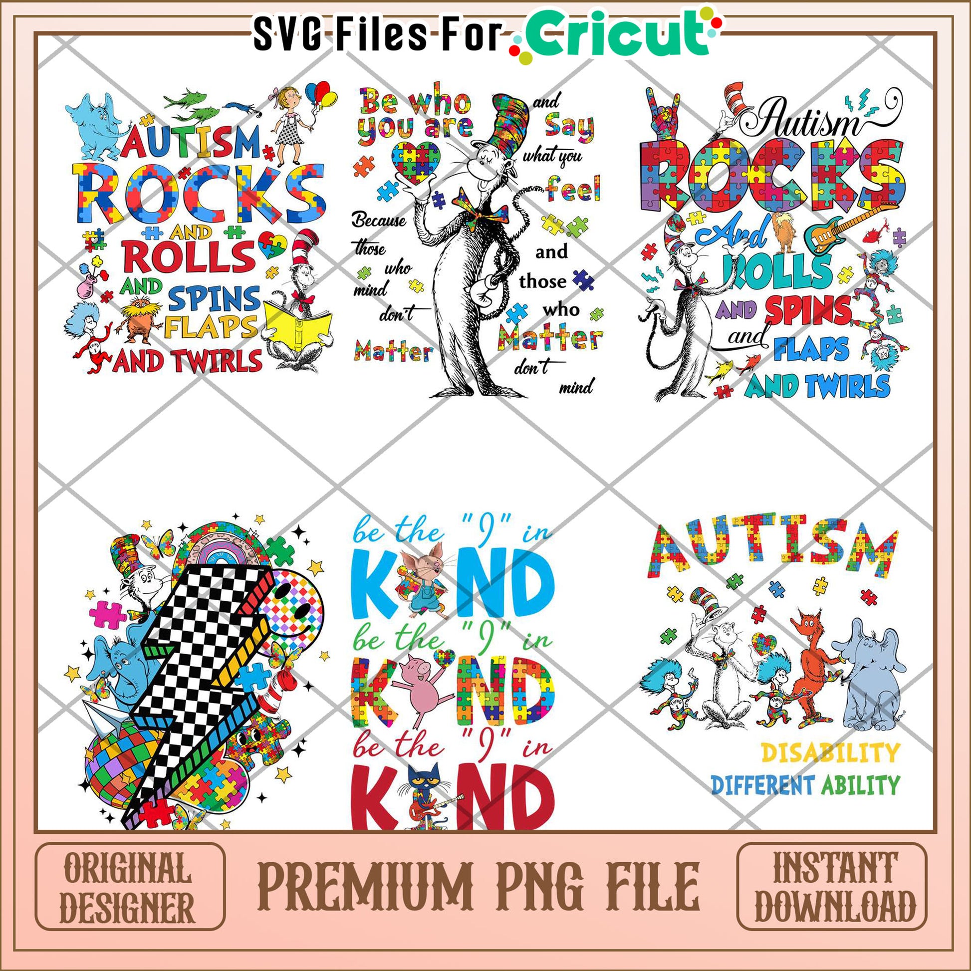Autism Themed Bundle of Colorful PNG Designs for Download is part of our Dr. Seuss collection, bringing Seuss's quirky world to life! Perfect for crafters, these high-quality, transparent PNG files are ideal for creating custom t-shirts, mugs, stickers, party decorations, and more. From the mischievous Cat in the Hat to beloved characters like Horton and the Lorax, this collection captures the charm and imagination of Dr. Seuss's timeless stories. Each design is easy to use with Cricut, Silhouette, and other cutting machines. Add a little Seuss magic to your DIY projects and celebrate creativity in true Dr. Seuss style!