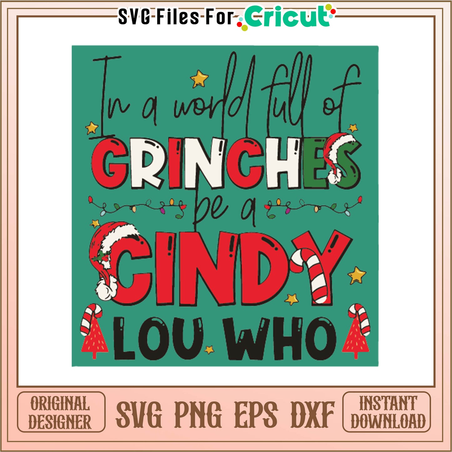 Cindy lou who funny in a world full svg is the perfect Christmas collection for holiday crafts, offering detailed, scalable images that work great with Cricut, Silhouette, and other cutting machines. From festive icons like snowmen, Christmas trees, and stockings to playful phrases and intricate mandalas, these SVGs add a creative touch to cards, ornaments, shirts, and home decor. The SVG format offers smooth lines and crisp details, making it ideal for both vinyl and paper crafts. Whether you're personalizing a gift or designing unique holiday decorations, Christmas SVG files allow for endless customization and make it easy to spread cheer in all your holiday projects.