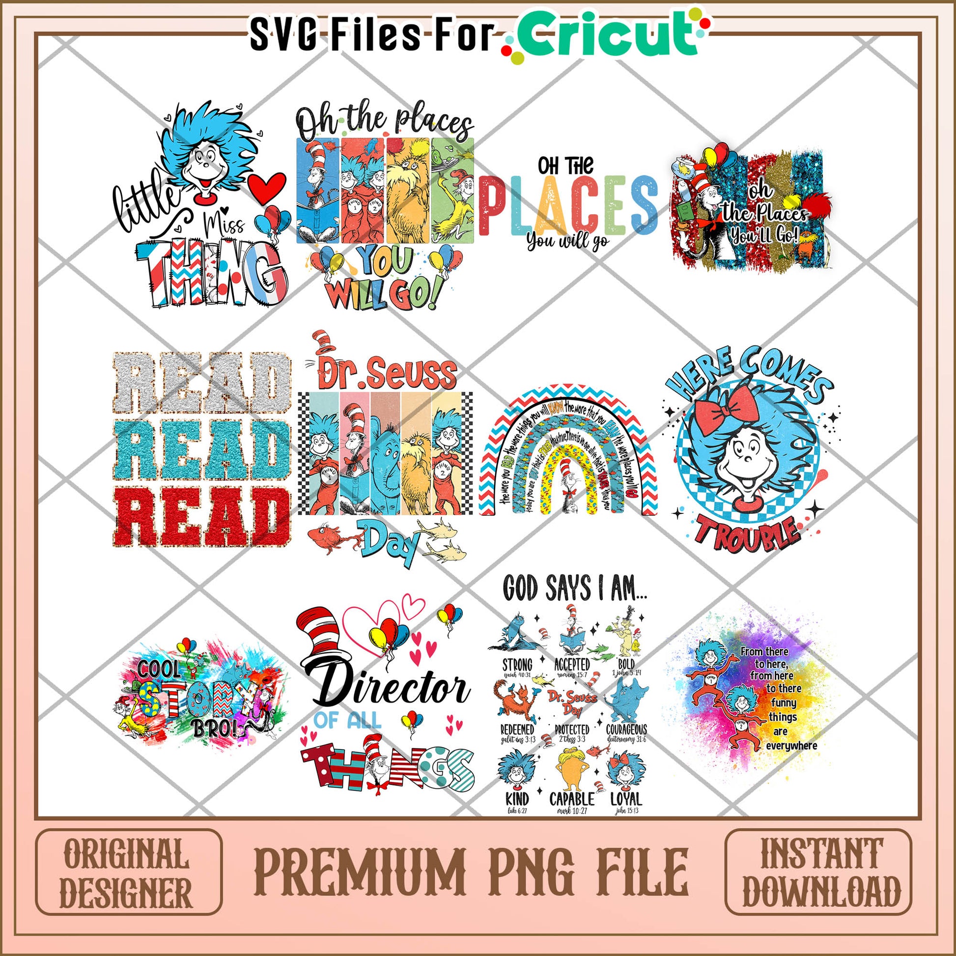 Colorful Dr Seuss Themed PNG Bundle for Creative Projects is part of our Dr. Seuss collection, bringing Seuss's quirky world to life! Perfect for crafters, these high-quality, transparent PNG files are ideal for creating custom t-shirts, mugs, stickers, party decorations, and more. From the mischievous Cat in the Hat to beloved characters like Horton and the Lorax, this collection captures the charm and imagination of Dr. Seuss's timeless stories. Each design is easy to use with Cricut, Silhouette, and other cutting machines. Add a little Seuss magic to your DIY projects and celebrate creativity in true Dr. Seuss style!