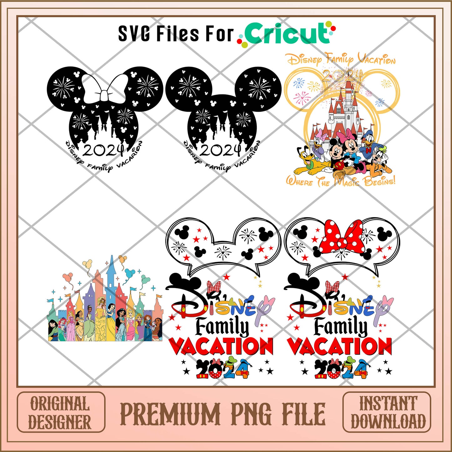 - Mickey and Minnie Vacation: Designs featuring Mickey and Minnie with phrases like "Disney Family Vacation 2024," adorned with fireworks and castle silhouettes.