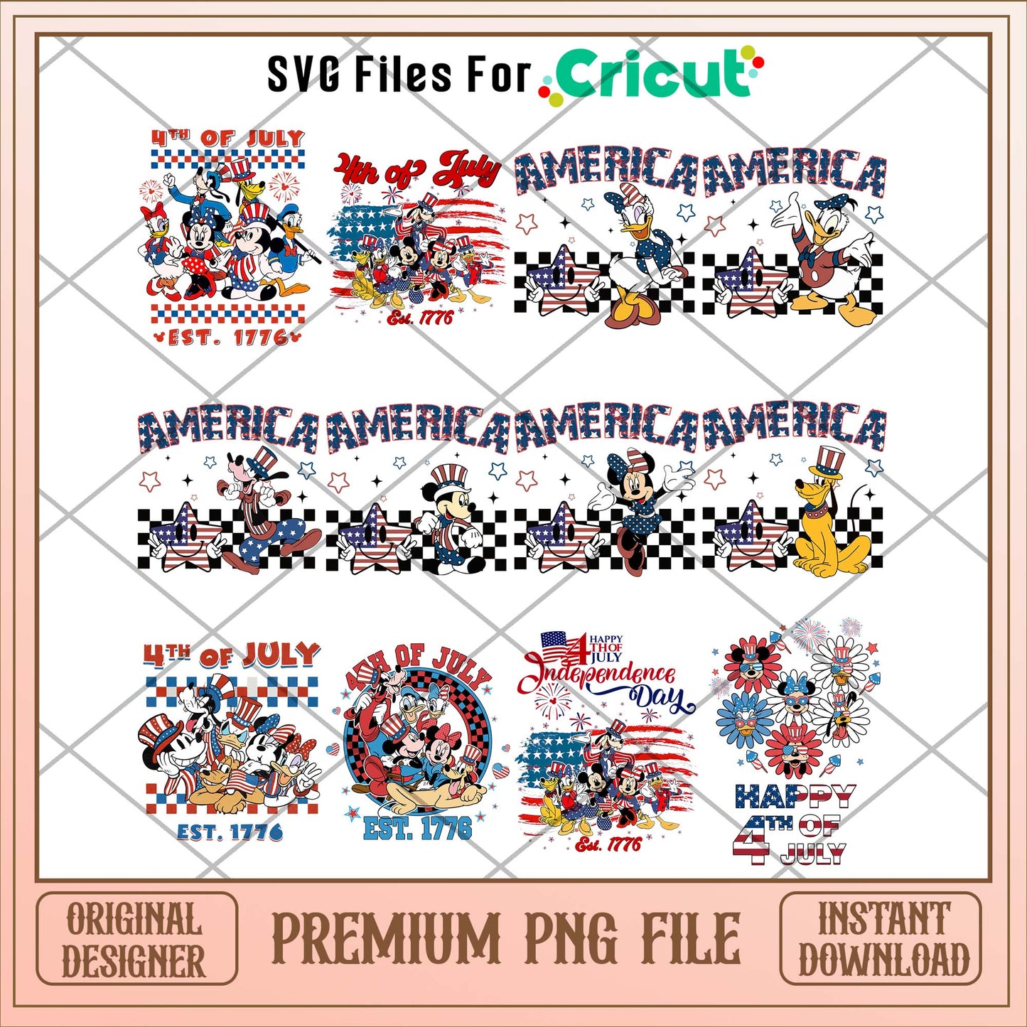 Get ready to add a burst of fun to your birthday celebrations with our Disney friends America 4th of july png bundle! This digital download features high-resolution designs ideal for personalizing birthday decorations, apparel, and more.