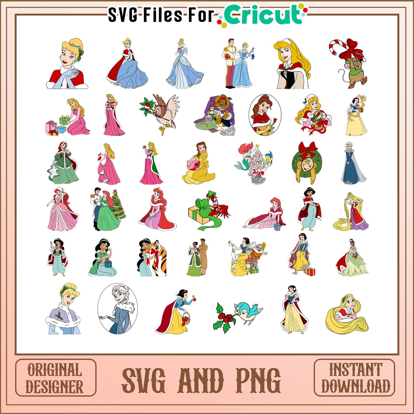 Disney princess christmas bundle svg is the perfect Christmas collection for holiday crafts, offering detailed, scalable images that work great with Cricut, Silhouette, and other cutting machines. From festive icons like snowmen, Christmas trees, and stockings to playful phrases and intricate mandalas, these SVGs add a creative touch to cards, ornaments, shirts, and home decor. The SVG format offers smooth lines and crisp details, making it ideal for both vinyl and paper crafts. Whether you're personalizing a gift or designing unique holiday decorations, Christmas SVG files allow for endless customization and make it easy to spread cheer in all your holiday projects.