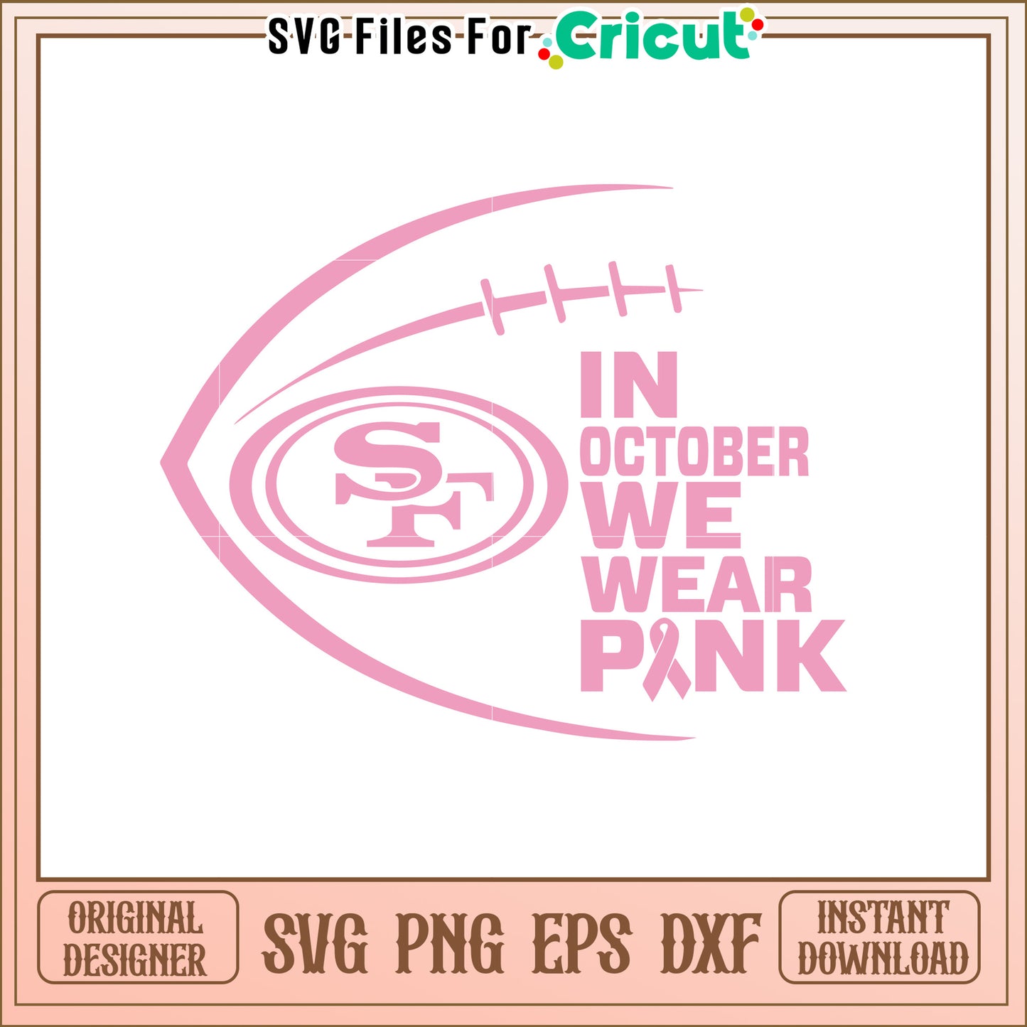 In October We Wear Pink Football SVG Design File is part of our NFL collection, perfect for football fans and creative projects! Whether you're crafting game day apparel, customizing mugs, or designing home decor, our high-quality SVG files will bring your favorite team to life. Featuring team logos, mascots, and football-inspired designs, these files are ideal for Cricut, Silhouette, and other cutting machines. Show off your team spirit with stunning graphics that are easy to use for personal and commercial projects. From Super Bowl celebrations to everyday fan paraphernalia.