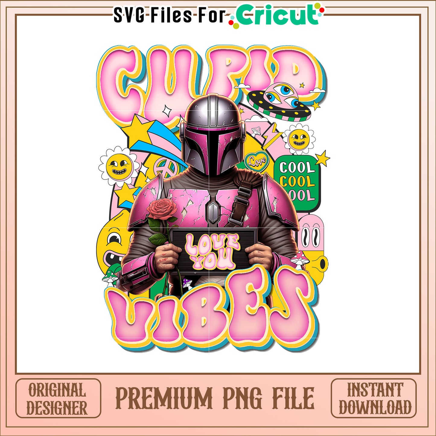 Mandalorian Love Vibes PNG is a part of our charming Valentine collection. With high-quality designs featuring transparent backgrounds, these files are perfect for all your Valentine's Day projects. From romantic hearts and roses to cute cupids and love quotes, this collection has everything you need to create personalized gifts, cards, t-shirts, mugs, and more. Ideal for digital or print design, these Valentine PNGs add a romantic touch to any project. Whether you're preparing for a special day or creating expressions of love all year round, our diverse designs are here to inspire.