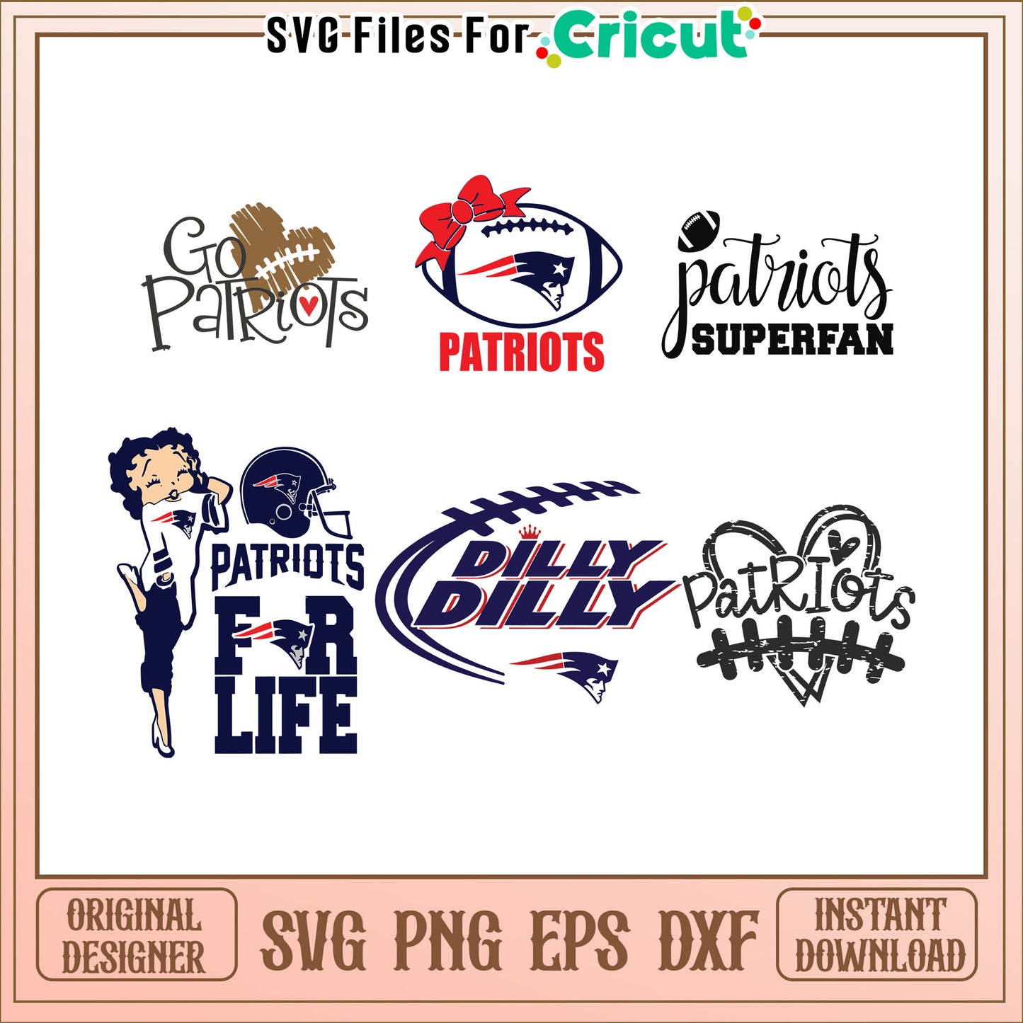 Patriots SVG Bundle 5 Designs Instant Download is part of our NFL collection, perfect for football fans and creative projects! Whether you're crafting game day apparel, customizing mugs, or designing home decor, our high-quality SVG files will bring your favorite team to life. Featuring team logos, mascots, and football-inspired designs, these files are ideal for Cricut, Silhouette, and other cutting machines. Show off your team spirit with stunning graphics that are easy to use for personal and commercial projects. From Super Bowl celebrations to everyday fan paraphernalia.