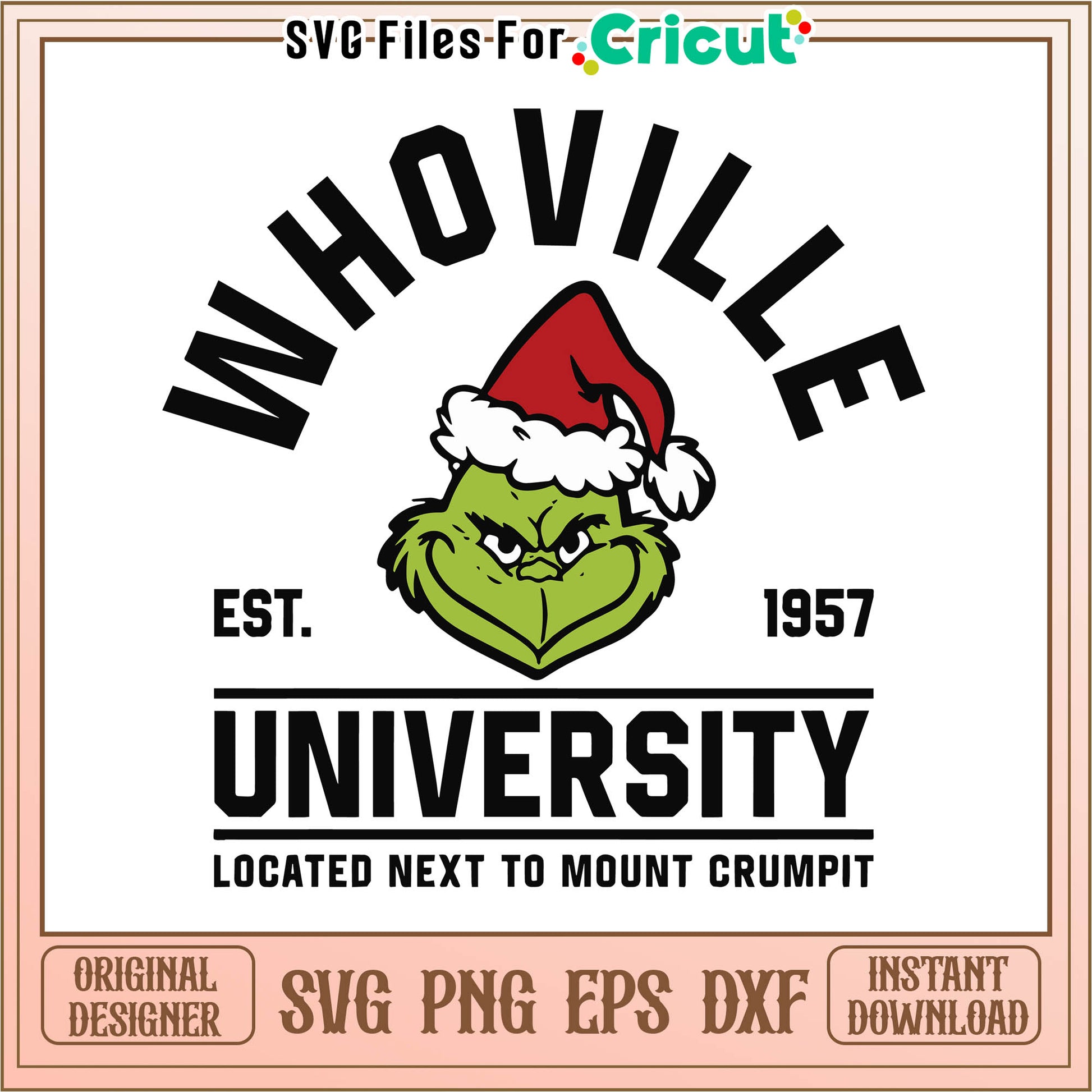 Santa grinch whoville university est 1957 svg is the perfect Christmas collection for holiday crafts, offering detailed, scalable images that work great with Cricut, Silhouette, and other cutting machines. From festive icons like snowmen, Christmas trees, and stockings to playful phrases and intricate mandalas, these SVGs add a creative touch to cards, ornaments, shirts, and home decor. The SVG format offers smooth lines and crisp details, making it ideal for both vinyl and paper crafts. Whether you're personalizing a gift or designing unique holiday decorations, Christmas SVG files allow for endless customization and make it easy to spread cheer in all your holiday projects.